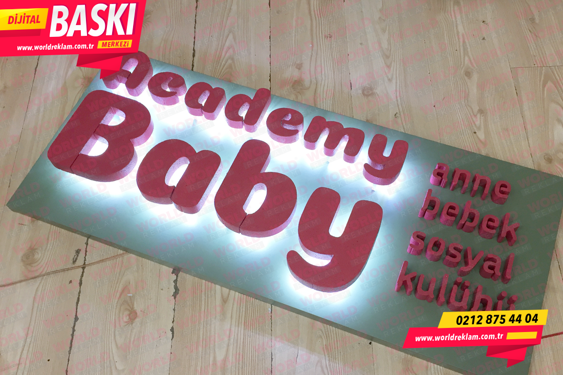 Academy Baby firması için yapmış olduğumuz ışıklı strafor tabela örneğidir.